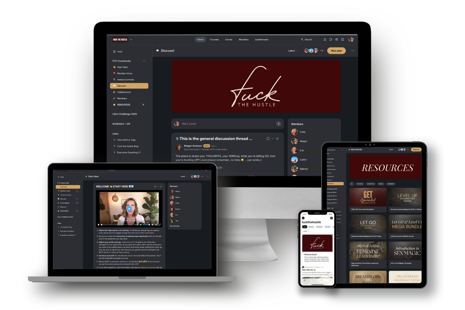 For $33/month get exclusive access to all the best Fuck the Hustle content, an up-leveled social circle and first dibs on all new masterclasses and programs, monthly LIVE practices, as well as rewards for inviting new members, and exclusive discounts on special programs.